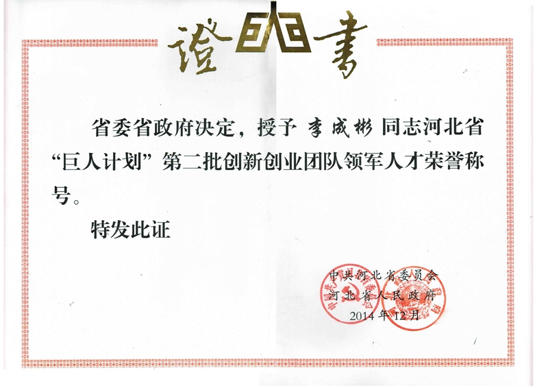 光源太陽能董事長李成彬,被授予河北省“巨人計(jì)劃”第二批創(chuàng)新創(chuàng)業(yè)團(tuán)隊(duì)領(lǐng)軍人才榮譽(yù)證書