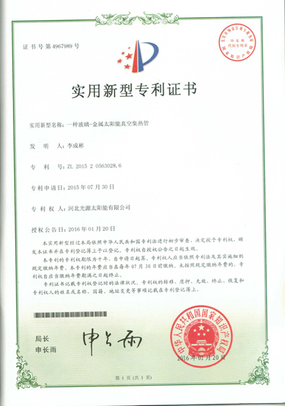 實(shí)用新型專利證書--一種玻璃-金屬太陽能真空集熱管