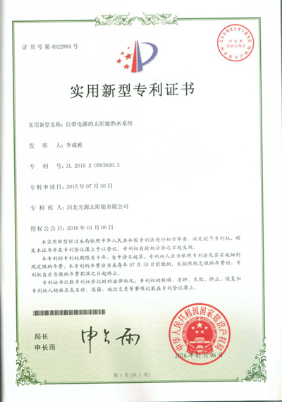 實(shí)用新型專利證書--自帶電源的太陽能熱水系統(tǒng)