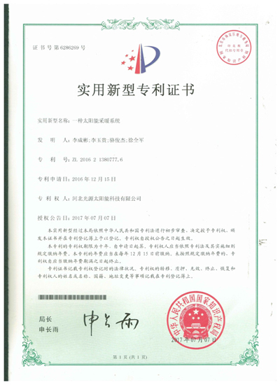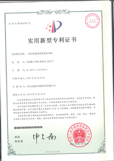 實(shí)用新型專利證書--一種太陽能采暖系統(tǒng)