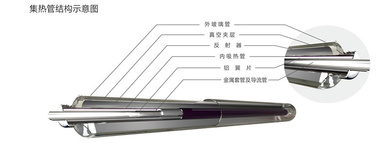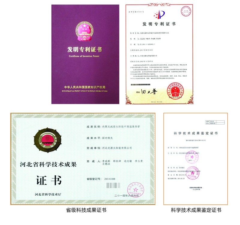 技術(shù)特點(diǎn):一是內(nèi)置CPC反射器。外罩玻璃管與吸熱管采用同軸套管,在真空管內(nèi)壁下半周設(shè)置金屬拋物面反射器,運(yùn)用拋物面原理實(shí)現(xiàn)了全角度采光,反射器不受大氣污染,聚光效果更好。二是耐高溫鍍膜技術(shù)。內(nèi)吸熱管表面濺射耐高溫太陽吸收膜層,內(nèi)外管之間抽真空,工作溫度400℃以上膜層不脫落、不老化。三是強(qiáng)制傳質(zhì)傳熱技術(shù)。在吸熱管內(nèi)插裝金屬套管,套管內(nèi)置入金屬導(dǎo)熱管,使管內(nèi)的介質(zhì)容量減少了70%,大大提高了傳質(zhì)傳熱效率。四是安全承壓技術(shù)。金屬套管與聯(lián)集箱采用絲扣連接,保證系統(tǒng)工作安全可靠。經(jīng)權(quán)威機(jī)構(gòu)檢驗(yàn),太陽能吸收比、熱損系數(shù)、真空品質(zhì)等技術(shù)指標(biāo)均優(yōu)于國家標(biāo)準(zhǔn)。采用該產(chǎn)品組成的太陽能中高溫?zé)崂孟到y(tǒng),穩(wěn)定工作溫度可達(dá)到163℃蒸汽,真正實(shí)現(xiàn)了太陽能由“熱水應(yīng)用”到“熱能應(yīng)用”的跨越式提升,填補(bǔ)了國內(nèi)太陽能中高溫真空集熱管在160℃溫區(qū)的技術(shù)空白。科技成果鑒定認(rèn)為:該產(chǎn)品的綜合性能達(dá)到了“國內(nèi)領(lǐng)先水平”,系統(tǒng)可廣泛用于太陽能飲用開水、采暖制冷、食品加工、紡織印染、農(nóng)副產(chǎn)品烘干等多種行業(yè)。對(duì)促進(jìn)大氣污染治理,推動(dòng)我國能源結(jié)構(gòu)調(diào)整具有重要意義。